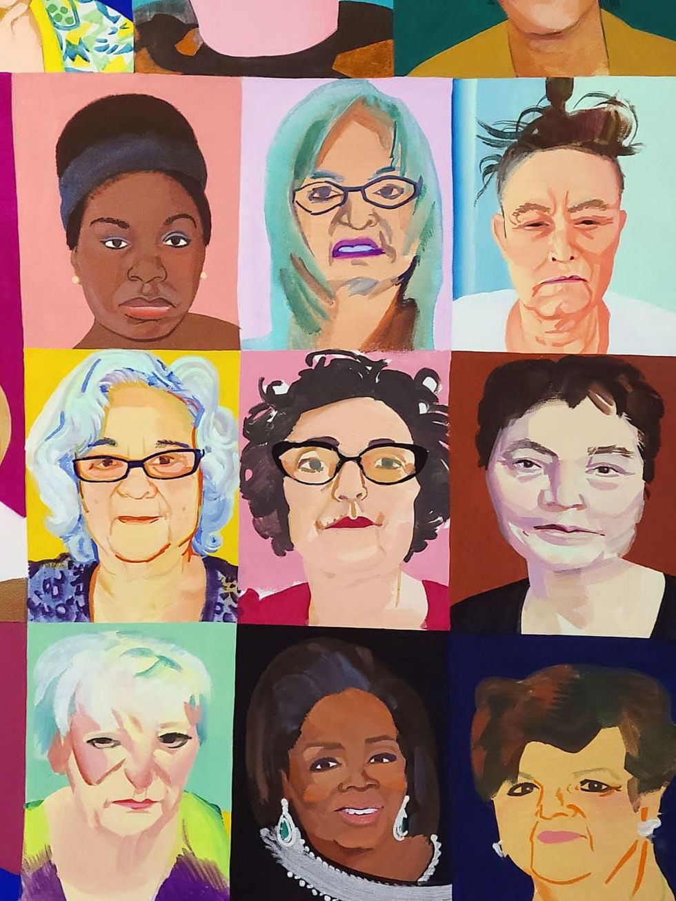 The exhibition also features the monumental painting titled My Matrilineage, 58 portraits on a single 60 x 48 inch canvas of women who have inspired or influenced the artist. In addition to the portrait of author Bonnie Lyons, My Matrilineage presents portraits of Grodin’s mother, aunts and art teachers plus a few pop-culture icons like Xena the Warrior Princess, singer Nina Simone, and Barbra Streisand’s character in the film Yentl.