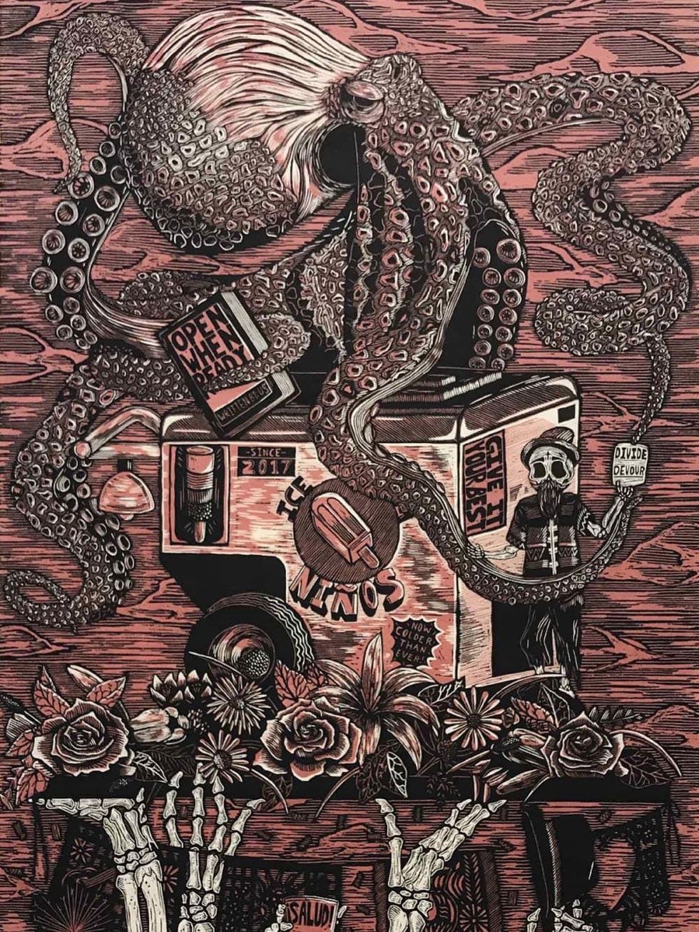 Muñoz is a largely self-taught artist and art instructor whose studio practice primarily focuses on printmaking. Originally from Corpus Christi, Munoz’s work reflects his Mexican heritage, upbringing, and current surroundings. His iconography, often composed in a stack, symbolizes the importance and dependence on previous generations and their direct ties to the interests of today and the future.