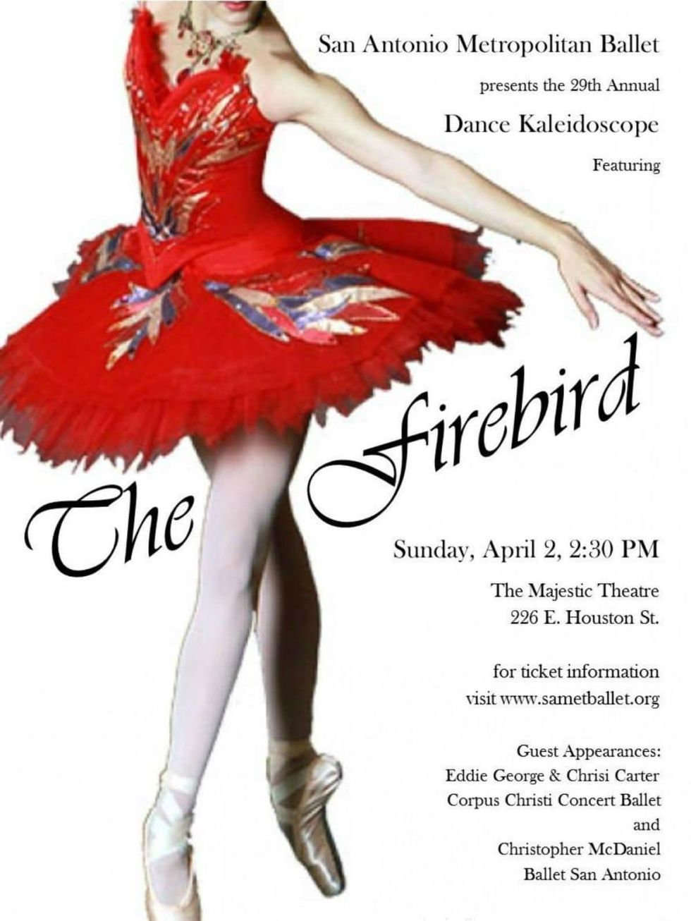 The performance will close with George Skibine’s “The Firebird,” staged by Thom Clower. Based on Russian fairy tales, this ballet is about a magic Firebird who is captured by Prince Ivan. In return for her freedom she gives the Prince a magic feather which later helps him rescue his beloved Tsarevna from the monster Kostchei. Mr. Skibine’s original choreography from 1965 to Stravinsky’s 1945 rewritten score has been staged on ballet companies around the world. SA Met Ballet’s presentation will be a premier for San Antonio audiences. With original costumes from the Harkness and Paris Opera Ballet companies, this production promises to be visually and auditorily stunning.