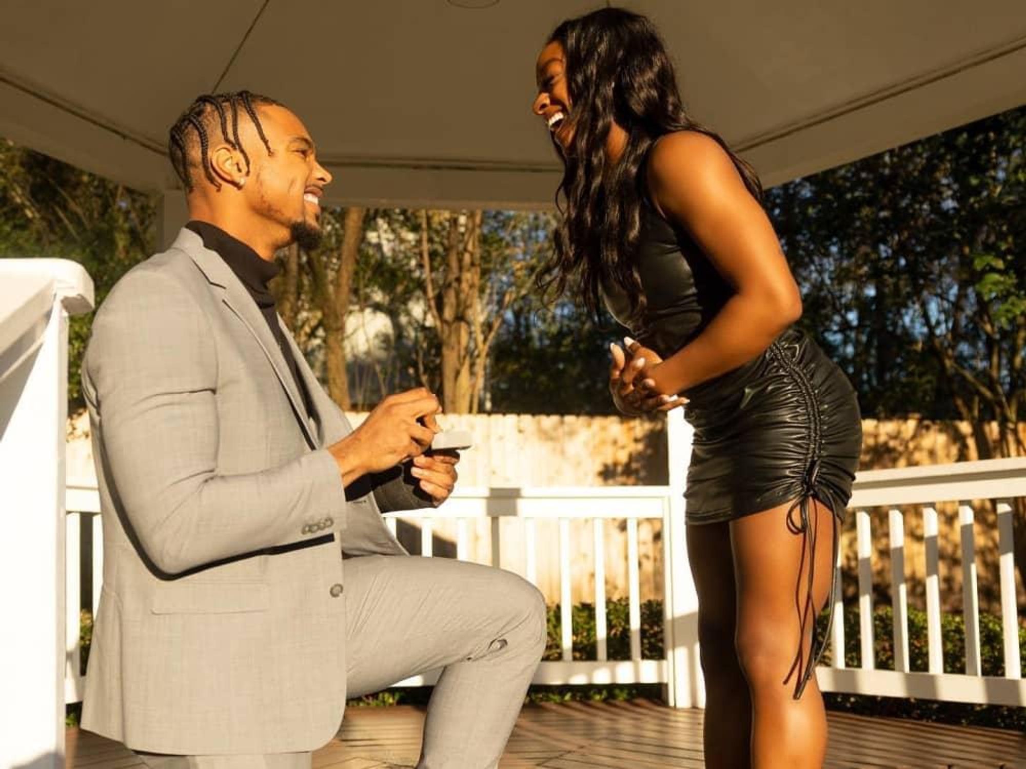 Photos of the couple show Owens in a suit on bended knee, while a gleeful Biles, decked out in a black dress, beams at the ring. She then jumps into his arms in a picturesque gazebo. The couple also share a kiss with champagne glasses, and a video reveals the dazzling ring. Biles and Owens had been vacationing in Las Vegas.